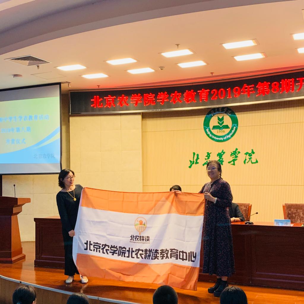 VSport体育北农耕读教育中心主管陈学珍教授为公司授旗,并为学农班授牌。