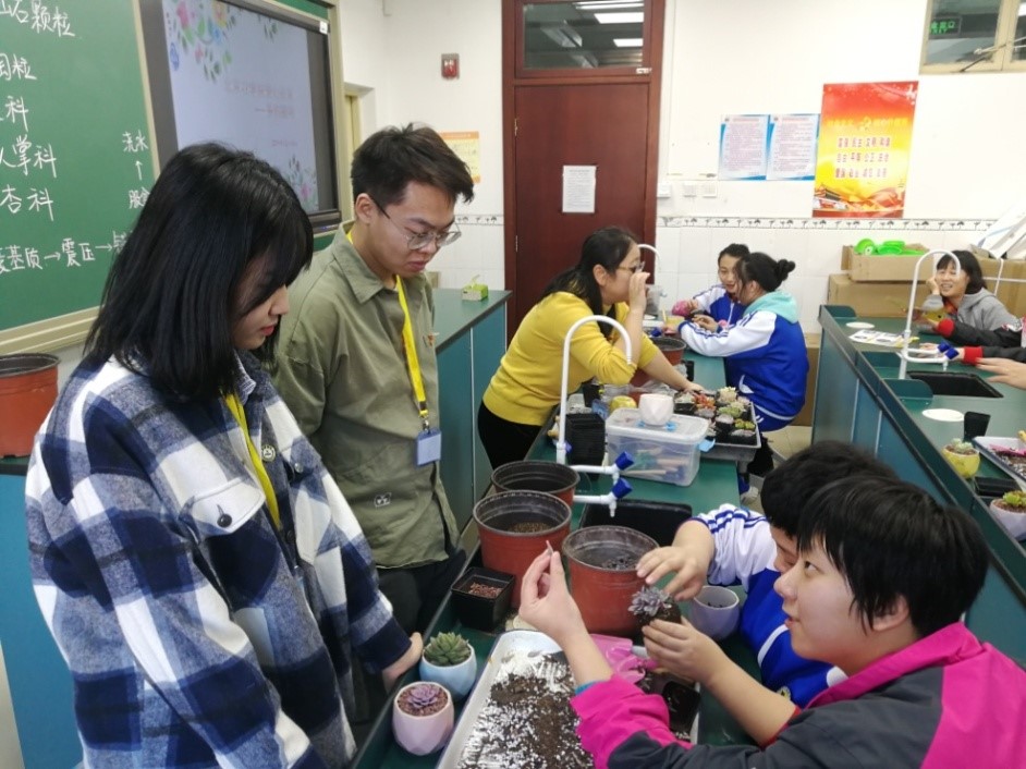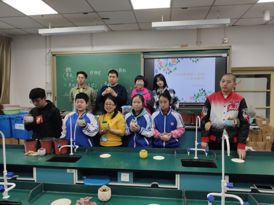 送课活动中,老师们以和蔼的态度、亲切的语言、耐心的指导,为十余名培智高中员工和60余名听障员工带来多肉植物栽培及压花小画课程。同时北农耕读团支部志愿者也参与到本次活动中。