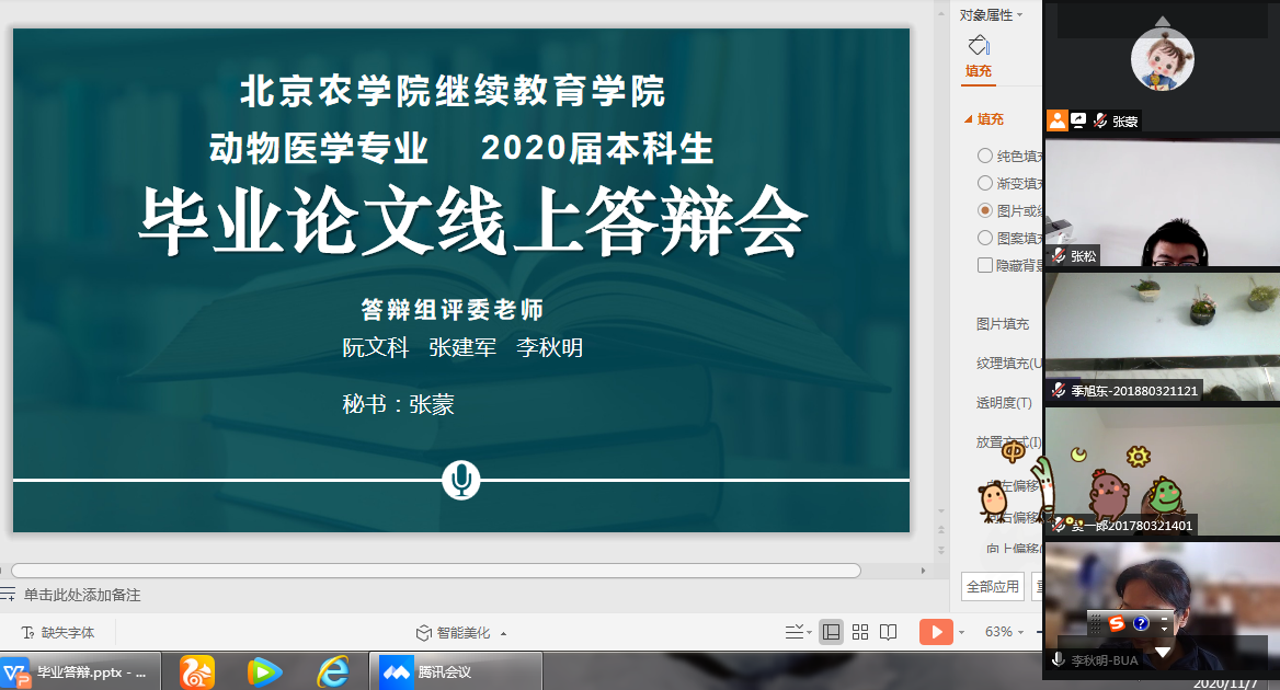 2018级成人高等教育本科生毕业论文线上答辩采用腾讯会议平台进行,共有动物医学、园林两个专业、三个小组的本科生参加本次论文答辩工作。通过在线共享、PPT汇报和视频问答等方式,实现师生无障碍沟通和交流。答辩工作在严谨、有序的环境中进行,参加答辩的员工准备充分,材料组织详实,答辩会场严肃认真。