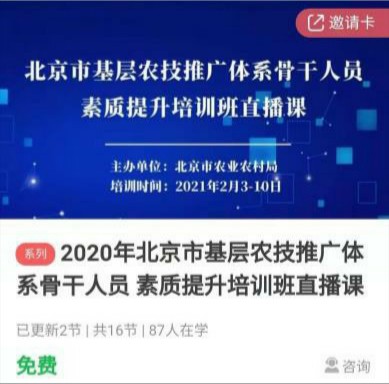 鉴于疫情实际,公司农村干部培训公司对外培训全面转战线上进行。经过团队紧锣密鼓的准备,2021年2月3日,“北京市基层农技推广体系骨干人员素质提升培训班”线上如期开班。本次培训是受北京市农业农村局科技处委托组织承办。