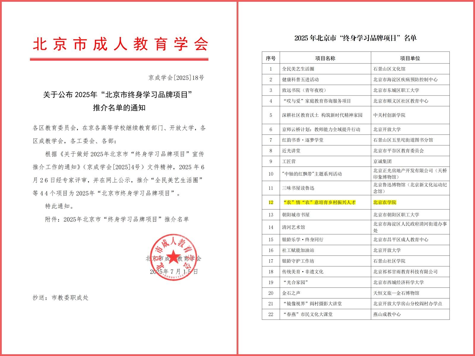 近日,北京市成人教育学会公布了2025年“北京市终身学习品牌项目”推介名单,VSport体育VSport体育申报的《“农”情“农”意培育乡村振兴人才》项目成功入选,成为全市唯一获此殊荣的高校项目。